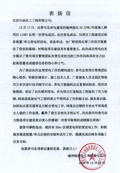 近日,延長石油榆神能化公司再次發(fā)來表揚(yáng)信,對北京石油化工工程有限公司總承包的50萬噸/年煤基乙醇項目110KV總變一次受電成功表示祝賀。此次受電成功,為項目工程建設(shè)后續(xù)各裝置/單元變電所送電、設(shè)備單試、全廠照明亮化等工作的開展奠定了堅實的基礎(chǔ),對推進(jìn)項目建設(shè)具有重要意義。