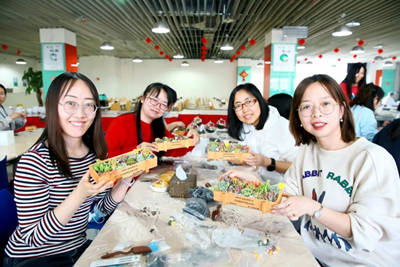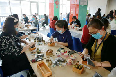 在下午開展的手工制作微景觀植物活動中,讓女職工顯露出動手的天賦。工作人員事先準備了制作微景觀多肉植物的相關材料,如玻璃瓶、木盒、繁殖土、鋪面石、裝飾砂石、擺件等,大家將不同種類的多肉植物搭配在一起,填土、配色、種植、鋪面,不一會,一盆盆精美的盆栽爭奇斗艷,大家分享經(jīng)驗,交流養(yǎng)護心得,釋放了壓力,舒緩了心情。