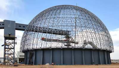 圓形煤場(chǎng)為全封閉半球形結(jié)構(gòu),建筑面積約5800平米,可堆放燃煤4萬(wàn)噸燃煤,滿足全廠儲(chǔ)煤要求,是全廠最大的鋼網(wǎng)結(jié)構(gòu)建筑。