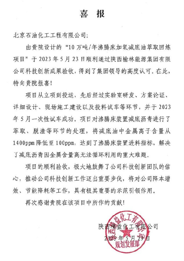 近日,由北京石油化工工程有限公司設(shè)計(jì)的陜西精益化工10萬(wàn)噸/年減底油萃取回?zé)掜?xiàng)目開(kāi)車成功并通過(guò)業(yè)主驗(yàn)收,得到業(yè)主的高度認(rèn)可。該項(xiàng)目以沸騰床煤焦油加氫裝置的減底油渣為原料,回收其中可重復(fù)利用的組分,并將油渣中的膠質(zhì)/瀝青質(zhì)及金屬離子含量控制在一定范圍內(nèi),從而滿足沸騰床回?zé)挼倪M(jìn)料要求,為焦油加氫企業(yè)處理未轉(zhuǎn)化的油渣提供了一條全新途徑,大幅提升了企業(yè)經(jīng)濟(jì)效益。(通訊員/韓金奇)