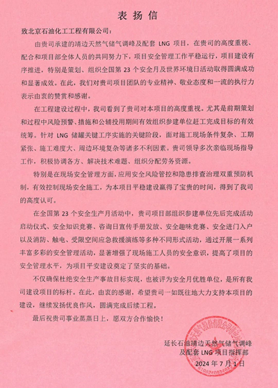 近日,由北京石油化工工程有限公司(簡稱:北油工程)總承包的延長石油靖邊天然氣儲氣調(diào)峰及配套LNG項(xiàng)目安全生產(chǎn)工作得到延長石油煉化公司肯定,項(xiàng)目部獲得2024年度“安全生產(chǎn)月”活動“先進(jìn)單位”稱號,3名員工獲得“安全之星”稱號。并收到表揚(yáng)信,對北油工程在項(xiàng)目建設(shè)期間,規(guī)范的安全管理,有序的項(xiàng)目建設(shè),專業(yè)的團(tuán)隊(duì)表示感謝。