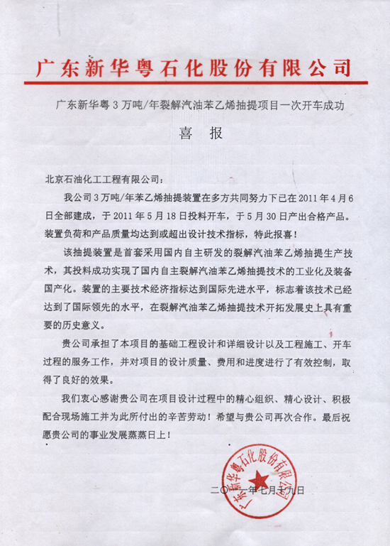 由我公司負(fù)責(zé)設(shè)計的廣東新華粵3萬噸/年裂解汽油苯乙烯抽提項目于2011年5月18日投料開車,并于5月30日產(chǎn)出合格產(chǎn)品。目前,裝置負(fù)荷和產(chǎn)品質(zhì)量均達(dá)到或超過設(shè)計技術(shù)指標(biāo)。為此,業(yè)主單位廣東新華粵石化股份有限公司特向我公司發(fā)來喜報。