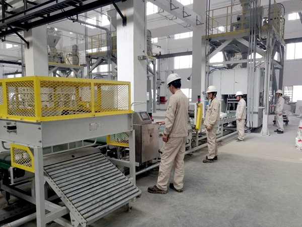 據(jù)悉,該裝置設(shè)置三條包裝線,單條包裝生產(chǎn)線每小時(shí)可以完成包裝1600袋40噸聚丙烯顆粒的能力。(通訊員/王秀珍 攝/王秀珍)