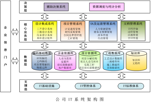 公司建立起以設計集成系統(tǒng)、項目管理系統(tǒng)、OA及運營管理系統(tǒng)、全面預算系統(tǒng)和文檔管理系統(tǒng)為主體的核心業(yè)務層系統(tǒng),對工程設計、工程項目管理、公司運營管理的日常工作起到支撐作用。